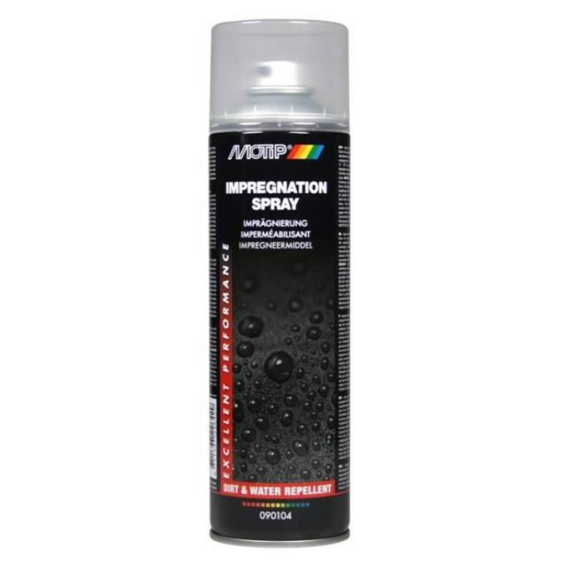 MOTIP impregnējošs aerosols IMPREGNATION SPRAY 500 ml flakonā, paredzēts dažādu tekstila un ādas izstrādājumu aizsardzībai pret mitrumu, kā arī netīrumu pieķeršanās novēršanai. Galvenokārt automašīnu saloniem, taču droši var izmantot arī citiem mērķiem, piemēram, apģērbam un apaviem, mēbelēm, un daudz cita. Pateicoties unikālajai formulai, tiek izveidota neredzama aizsargplēvīte, kas atvaira ūdeni, bet tajā pašā laikā ir arī elpojoša, novēršot netīrumu pieķeršanos materiālam. Vispiemērotākā temperatūra apstrādei ir 5 līdz 30 grādi. Virsmai jābūt tīrai un sausai. Uzklājiet impregnējošo līdzekli vairākos plānos slāņos, katru ar 5 līdz 10 minūšu intervālu.