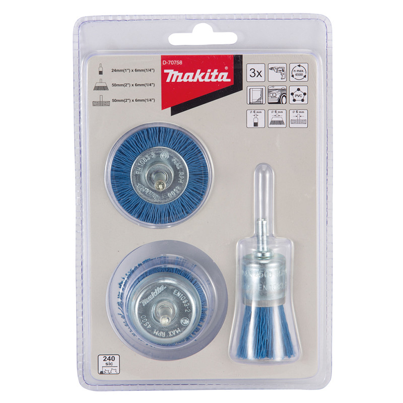 MAKITA neilona suku komplekts urbjmašīnām, ar trim birstēm - mazākai diametrs ir 24 mm, divām pārējām - 50 mm. Maksimālais apgriezienu skaits minūtē ir 4500. Patronas diametrs - 6 mm. Grauda raupjums - P240.