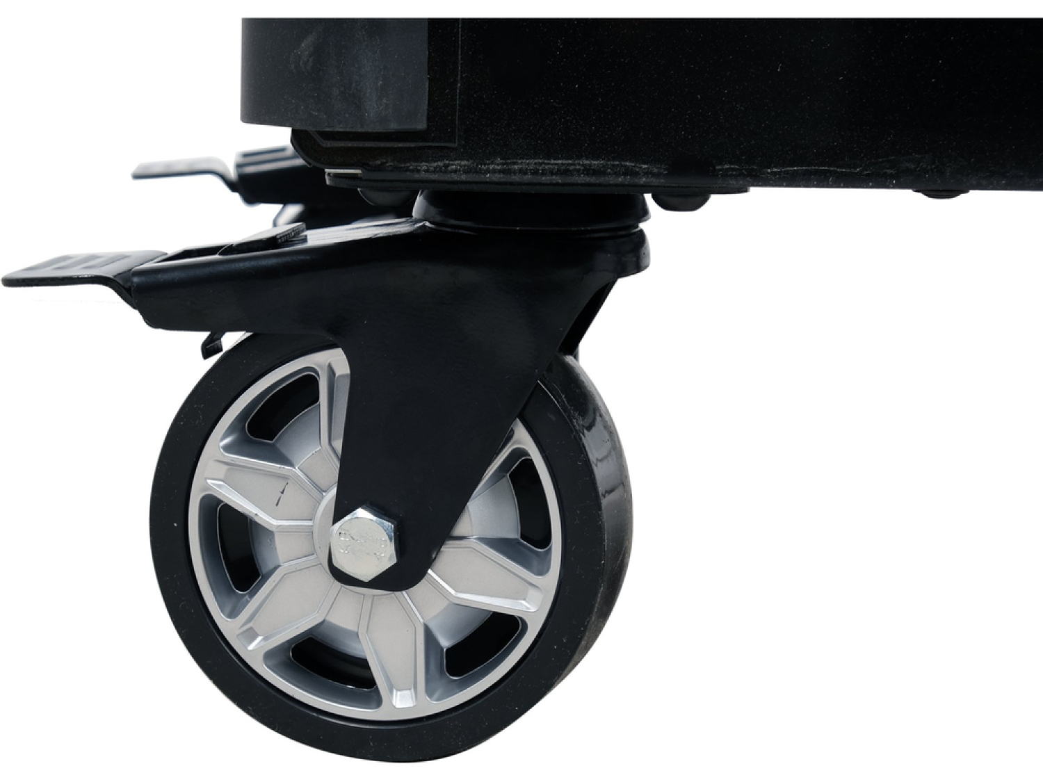 Drošā struktūra balstās uz četriem riteņiem, no kuriem divi ir pagriežami un aprīkoti ar bremzēm.
