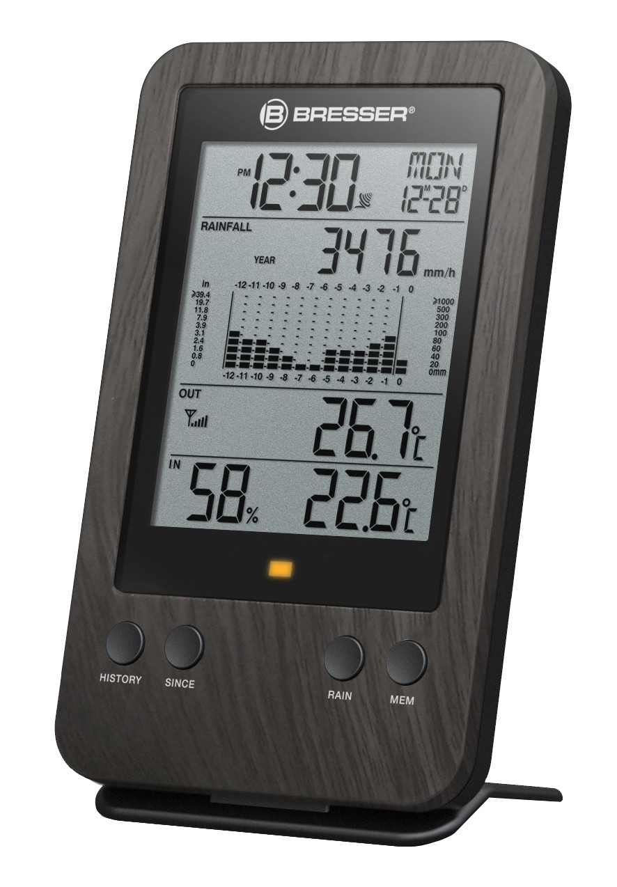 BRESSER Profiessional lietus mērītājs parāda detalizētas lietus mērījumu vērtības milimetros, kā arī tiek precīzi parādīta iekštelpu un āra temperatūra.