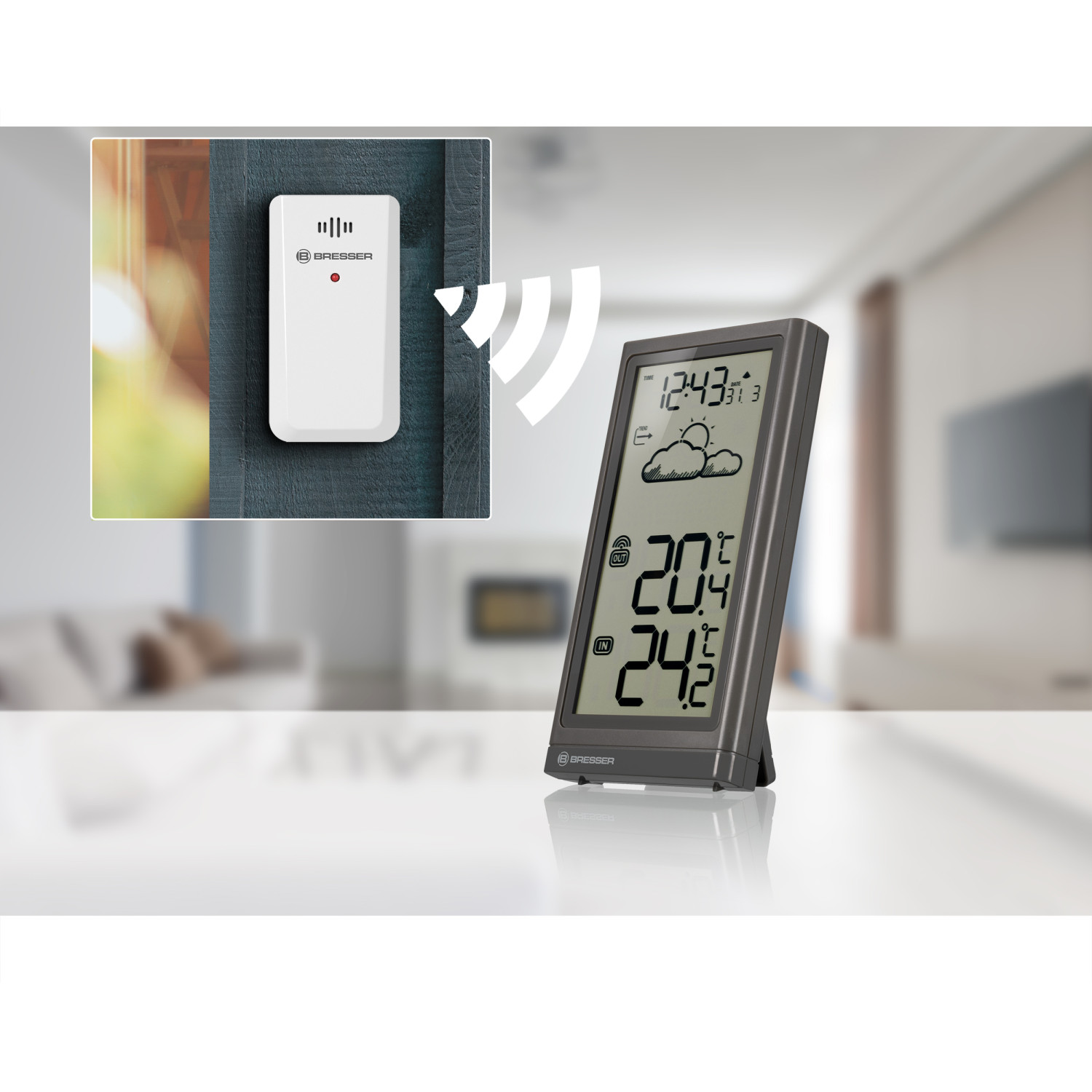 Bezvadu meteoroloģiskā stacija ar temperatūras un laika tendenču displeju un sala brīdinājumu.