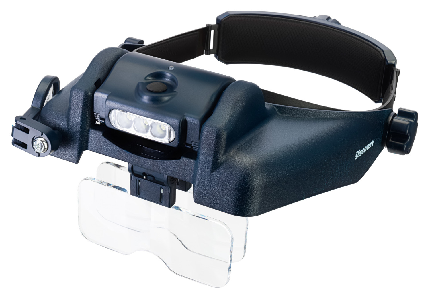 Palielināmās brilles ir piestiprinātas pie galvas ar regulējama galvas saiti.