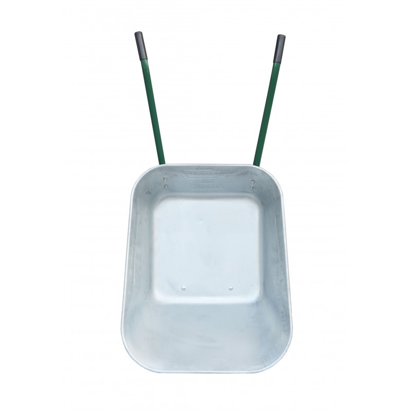 Dārza ķerra aprīkota ar diviem pneimatiskajiem riteņiem.