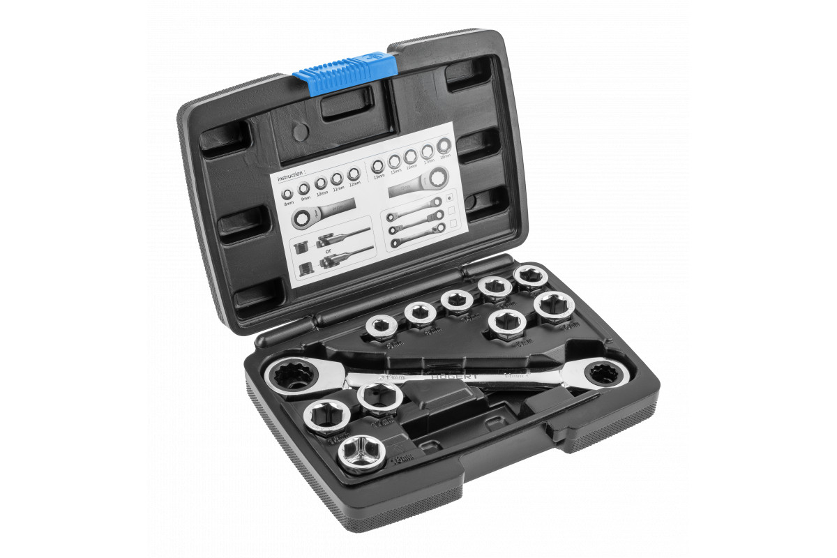 made of high-quality chrome-vanadium alloy steel, strong and durable; ratchet mechanism with 72 teeth; the set packed in a handy case for easy transport and storage of all elements. The set includes Combination ratchet spanner with joint in size 14 x 19 mm hexagonal sockets: 14 mm: 8, 9, 10, 11, 12 mm 19 mm: 13, 15, 16, 17, 18 mm