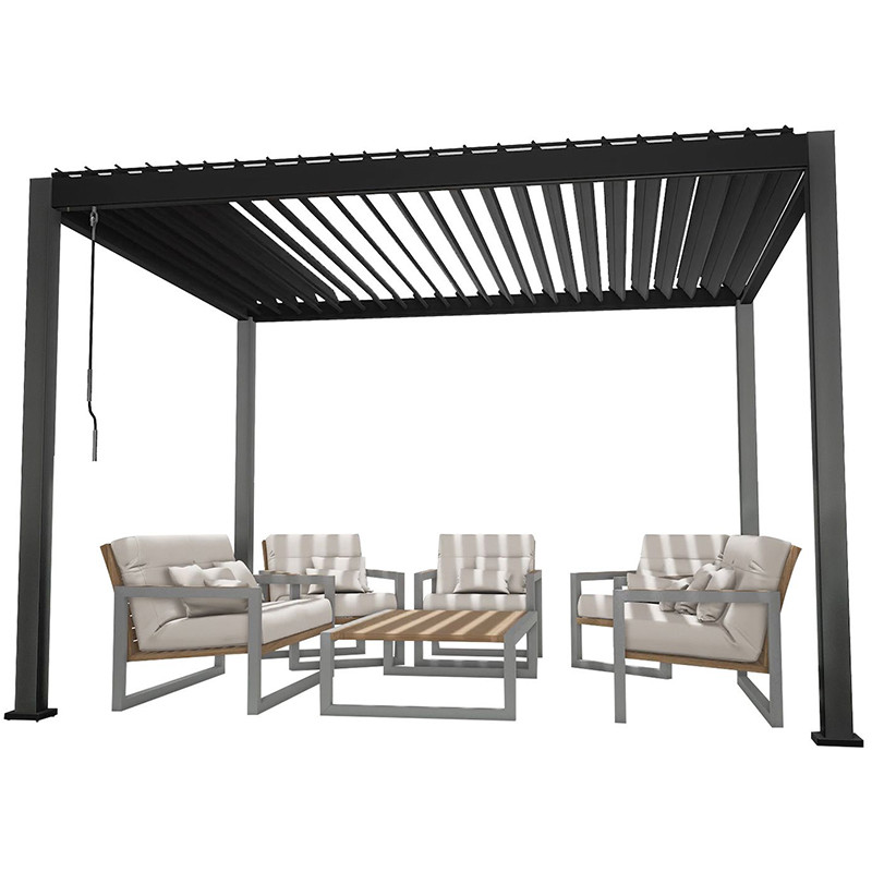 Novatoriskais jumts ar žalūzijām ir atverams un aizvēras ar sviras rokturi, un tas nodrošina aizsardzību un ēnojumu gan no neliela lietus, gan sveldzošas saules.