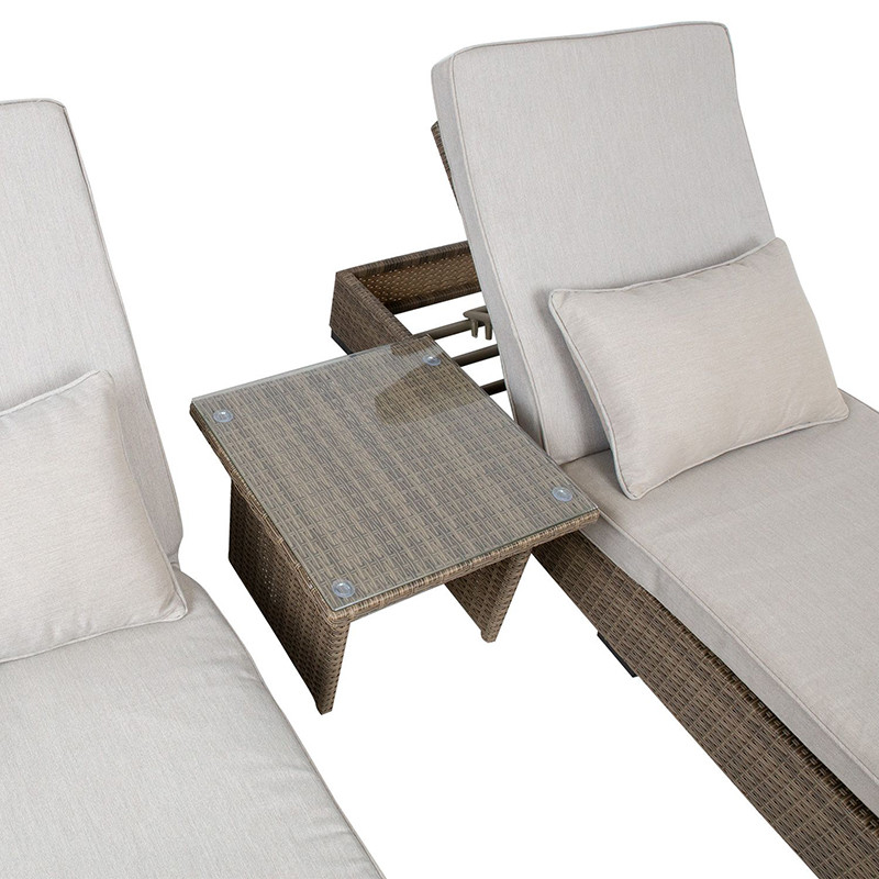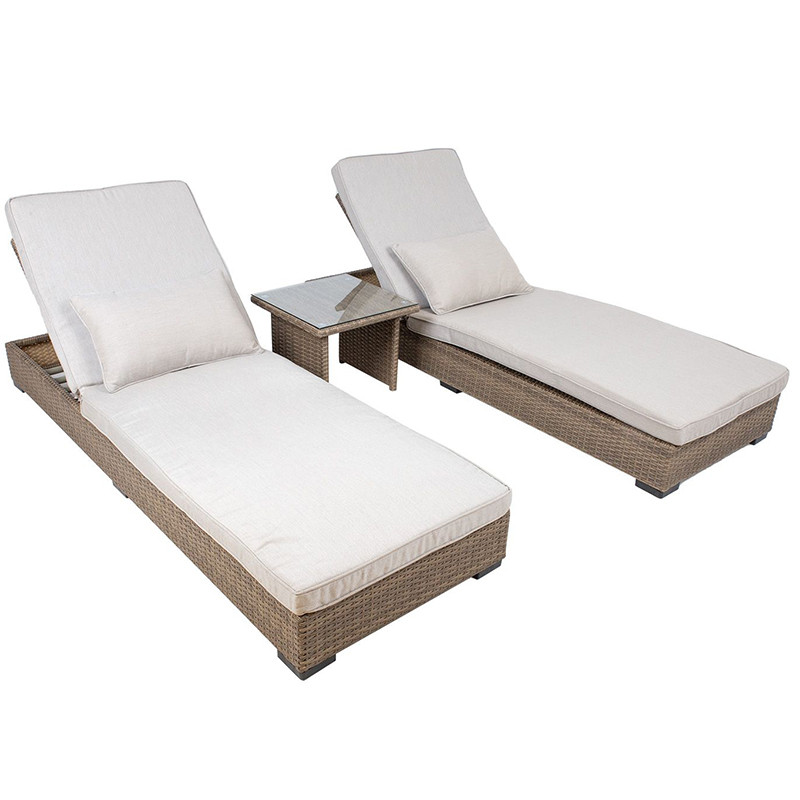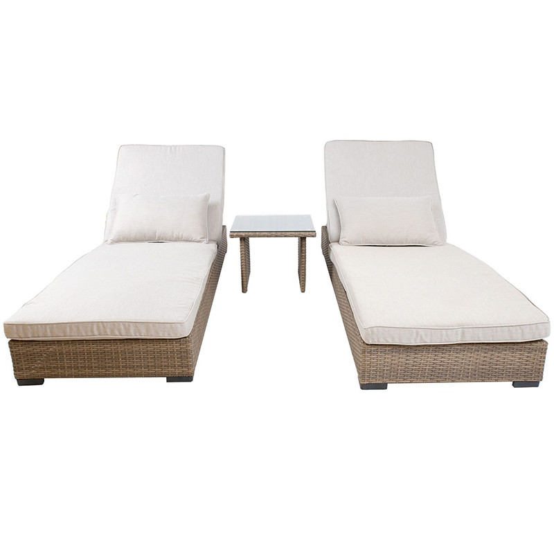 Komplektā ietilpst 2 sauļošanās krēsli ar mīkstiem spilveniem un sānu galds.