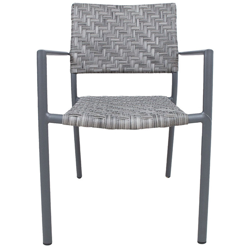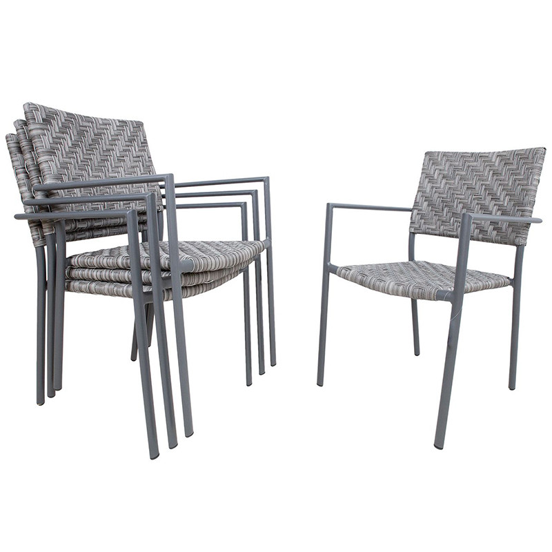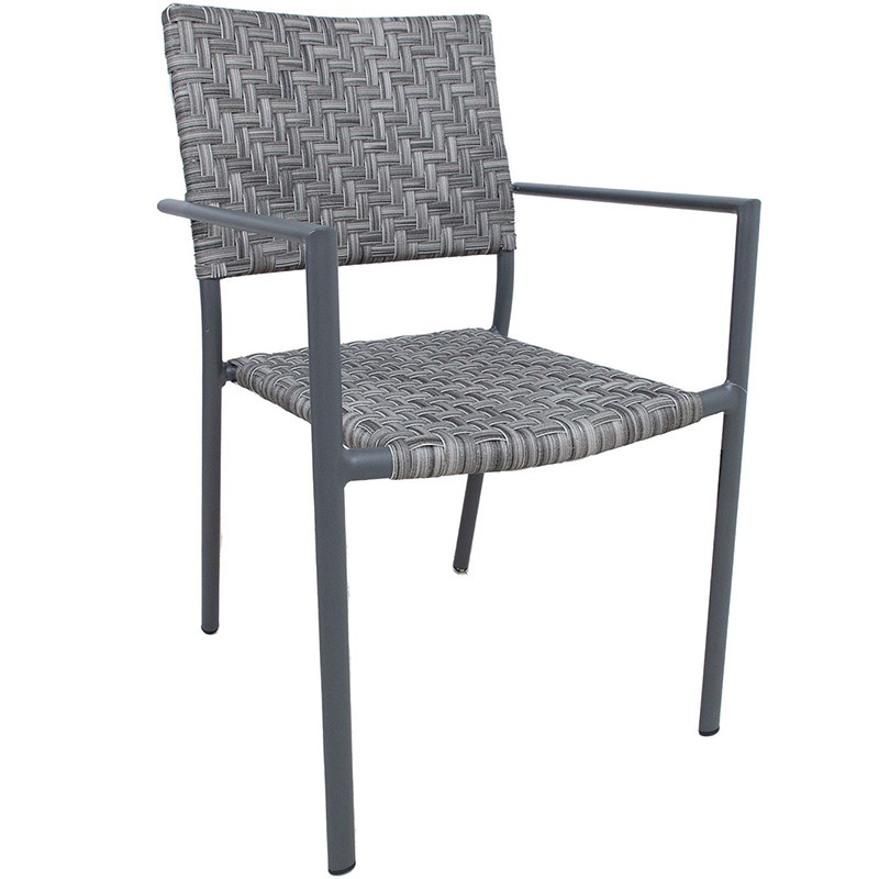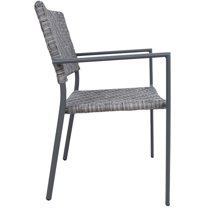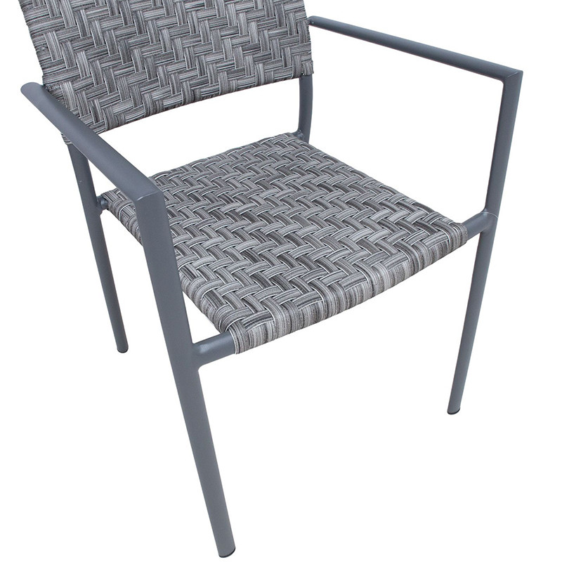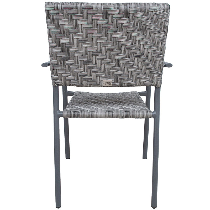 Krēsla sēdeklis un atzveltne ir izgatavoti no pelēcīgi plastmasas austas rotangpalmas.