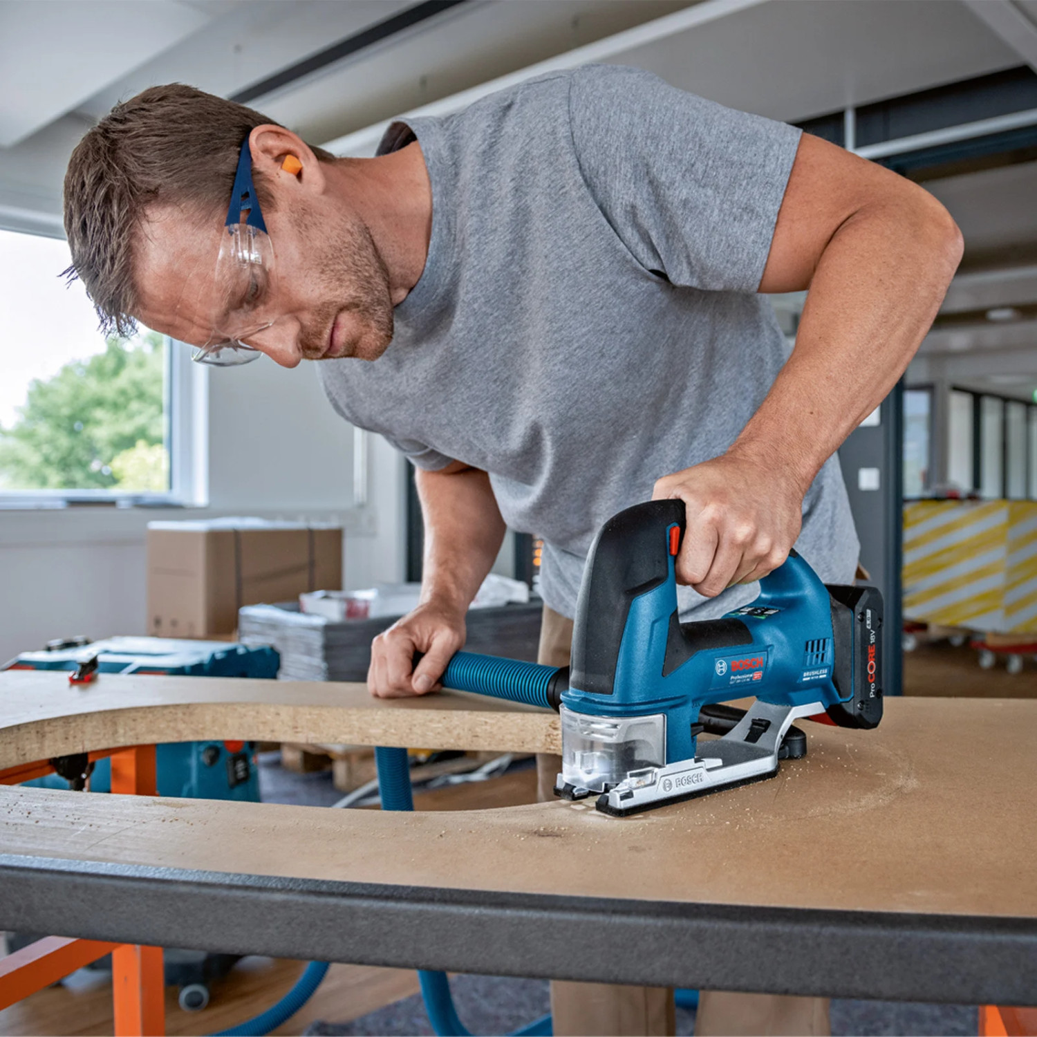 Ideāla meistarība vissarežģītākajai griešanai jebkurā pozīcijā - ar muciņveida rokturi GST 18V-155 SC Professional (ar muciņveida rokturi) ir aprīkots ar bezsuku dzinēju un labi balansētu instrumenta konstrukciju. Ergonomiska konstrukcija ar 360 ° satveršanas apkārtmēru un apbusēju slēdzi darbībai ar kreiso un labo roku palīdz nodrošināt perfektu kontroli pār instrumentu - pat zāģējot apgrieztā veidā. Zāģa asmens vadīkla aizsargā asmeni no saliekšanās pat mazos izliekumos un sniedz atbalstu darbam ar ideālu precizitāti. Instruments ir saderīgs ar ārēju papildierīci putekļu uzsūkšanai. Tā lielā zāģa asmens izvirzīšanas svira un nokrišanas kontroles īpašība nodrošina lielāku lietotāja veselības aizsardzību un drošību. Tas ir ideāli piemērots izliekumu griezumiem un šķērsgriezumiem blīvā koksnē, skaidu plātnē un koka kompozītmateriālos, kā arī biezākos un cietākos materiālos. Tas ir saderīgs ar vadotnes sliedēm ar adaptera palīdzību un ar visiem Bosch Professional 18V akumulatoriem un uzlādes ierīcēm (Professional 18V System). Tāpat tas ir saderīgs ar AMPShare, daudzzīmolu aliances akumulatoriem. Instruments tiek piegādāts ar robustu, lieta alumīnija balstplāksni ar diviem nostiprināšanas punktiem lielākai stabilitātei un drošībai. Adaptive Speed Control (ASC) sniedz atbalstu augstai precizitātei, uzsākot griešanu. Tā savienojamības modulis ļauj veikt individuālu ātruma un apgaismojuma iestatīšanu un nodrošina svarīgu instrumenta informāciju. Ergonomiska konstrukcija: ļauj 360 °satveršanas apkārtmēram nodrošināt perfektu kontroli pār instrumentu - pat zāģējot apgrieztā veidā Ideālai precizitāte: zāģa asmens vadīkla aizsargā asmeni no saliekšanās pat mazos izliekumos. Liela zāģa asmens izvirzīšanas svira, nokrišanas kontroles īpašība un ārēja papildierīce putekļu uzsūkšanai nodrošina lielāku lietotāja veselības aizsardzību un drošību Izturīga, lieta alumīnija balstplāksne ar diviem nostiprināšanas punktiem. Savienojamības modulis individuāla ātruma un apgaismojuma iestatīšanai un instrumenta statusa kontrolei