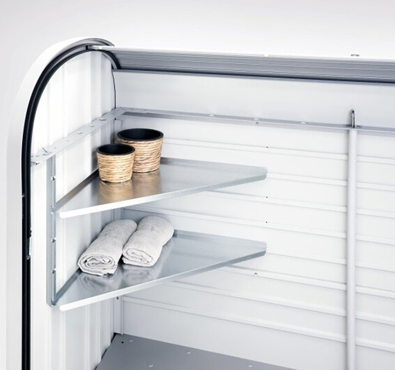 Bez piepūles bīdāmie rullīšu žalūzijas, kas izgatavotas no pārklāta alumīnija, nerūsēs un netiks ietekmēti laika apstākļu ietekmē, tāpēc tās būs pastāvīgi gatavas lietošanai. Atveres mehānisms ar atsperi padara to par bērnu rotaļlietām. Izturīgās aizmugures un sānu sienas, kas izgatavotas no karsti cinkotas, ar poliamīdu pārklātas tērauda plāksnes, padara StoreMax ļoti izturīgu.