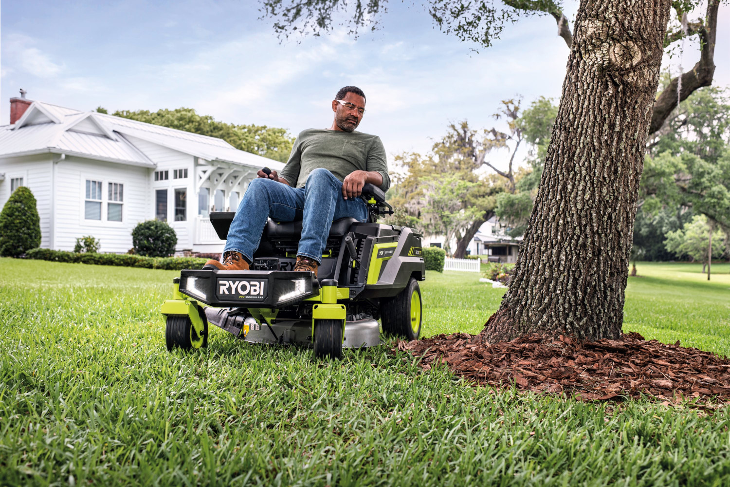 RYOBI pirmais raidera tipa zāles pļāvējs ar sviru vadību, ko darbina litija jonu akumulators.