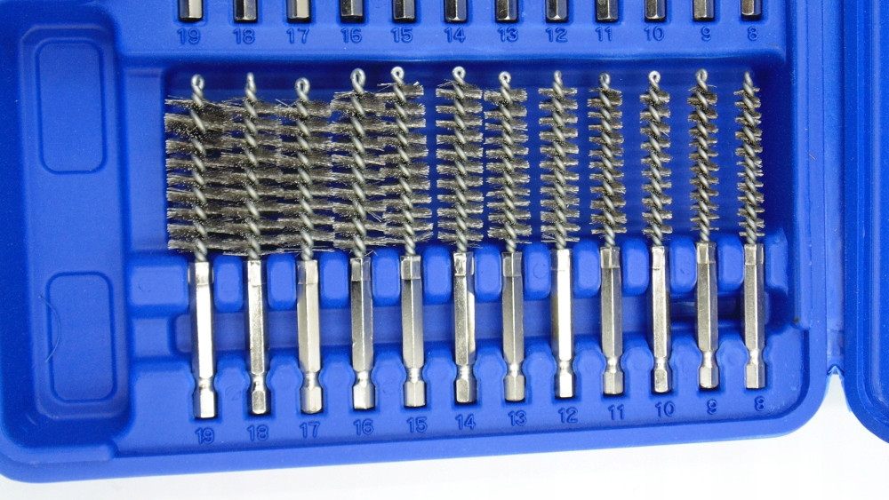 12 nerūsējošā tērauda, ​​misiņa un neilona birstes izmēros: 8, 9, 10, 11, 12, 13, 14, 15, 16, 17, 18, 19 mm.