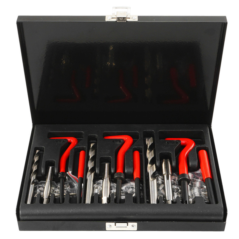 Kvalitatīvs vītņu remonta komplekts bojātu vītņu nomaiņai ar jaunu vītnes ieliktni. Urbji un krāni ir izgatavoti no HSS ātrgaitas tērauda.