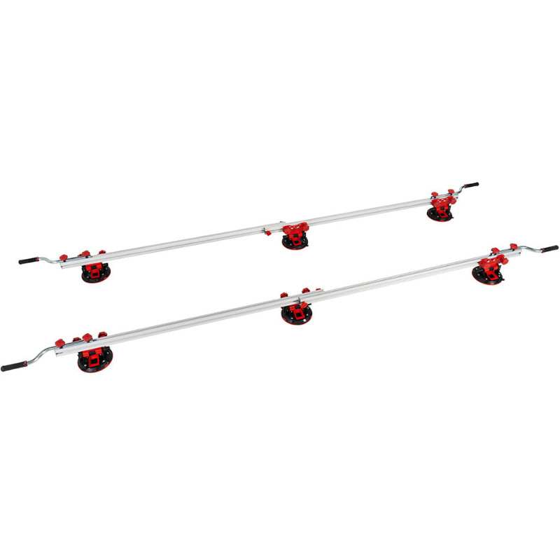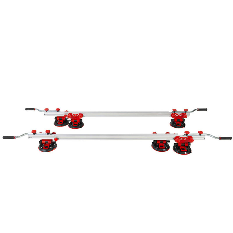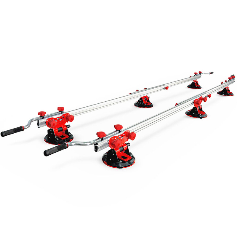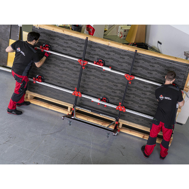 SLIM EASY TRANS PLUS transportētājs ietver 6 vakuuma piesūcekņus ar 20 cm diametru un lielu slodzi un noturību. Piesūcekņi var slīdēt un konfigurēt savu pozīciju atbilstoši porcelāna loksnes formātam. Vakuuma piesūceknis nodrošina papildu drošību un uzticamību materiāla nostiprināšanā. SLIM EASY TRANS transportēšanas sistēma ir īpaši izstrādāta, lai pārvietotos ar lielformāta, plāna biezuma porcelāna loksnēm līdz 320 cm garumā.