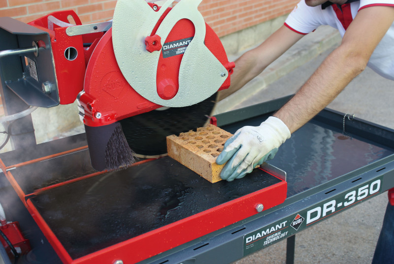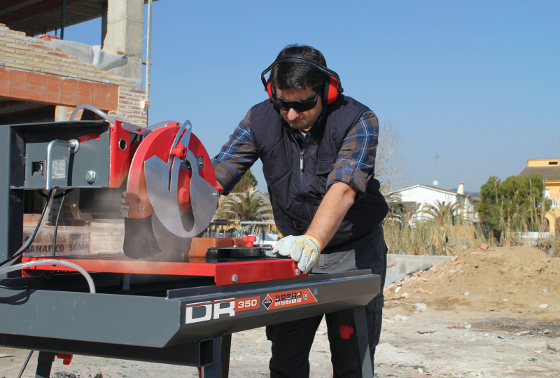 Ar lielo galdu (58,5 x 49,5 cm) DR-350 ir lieliski piemērots būvmateriālu un bruģa griešanai.
