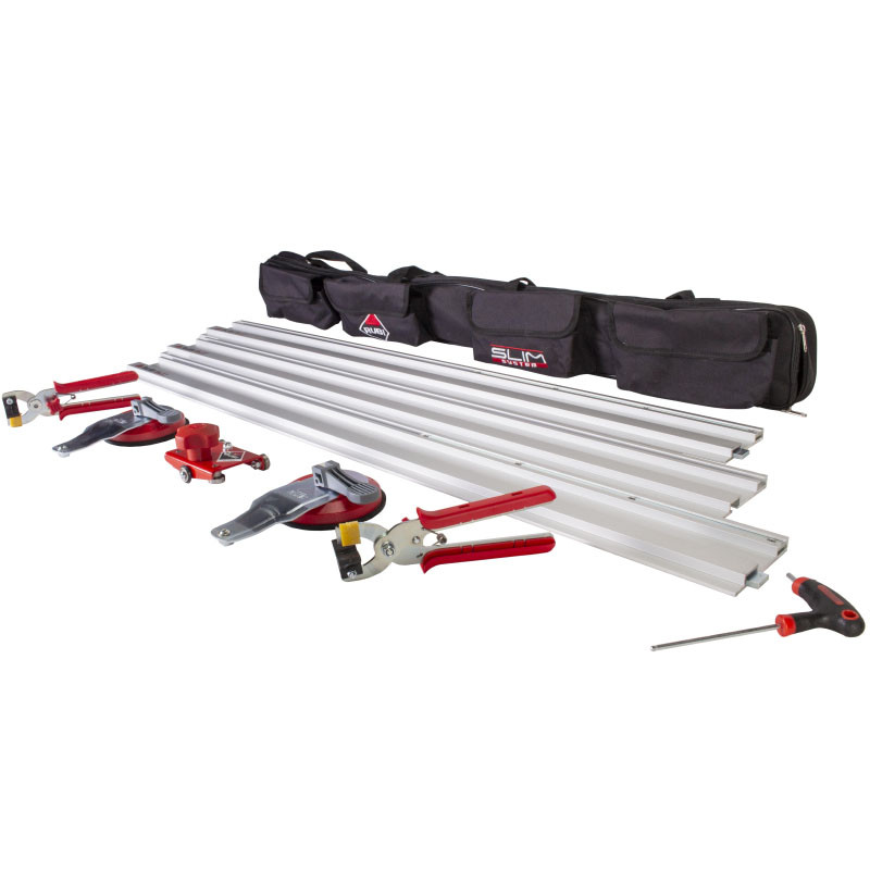 SLIM SYSTEM CUTTER ir manuāla griešanas iekārta, kas īpaši izstrādāta 3m x 1.2m un aptuveni 3 līdz 8 mm biezām flīzēm. Komplektācijā ietilpst: 3 x 110cm alumīnija tērauda stieņi, 22 mm volframa karbīda veltņa griezēja galva, 2 piespiedēji, 2 piesūcekņi un izturīgs neilona transportēšanas futrālis.