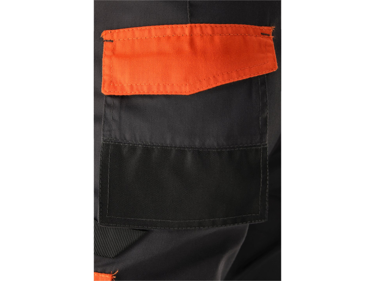 Рабочие брюки с девятью карманами, включая шесть с застежкой на липучке и специальные карманы для набивки. Основной материал — смесь хлопка и полиэстера в оптимальных пропорциях. Устойчивость к разрыву подобна более тяжелым изделиям из 100% хлопка, а небольшой вес делает материал легким и идеальным для теплых дней. Для соединений материала в наиболее подверженных разрыву местах использованы тройные швы. Основные характеристики: материал: 35% хлопка, 65% полиэстера, вес: 190 г/м². Организация работы: ниже пояса спереди многофункциональные карманы, включая два основных кармана, два накладных кармана с застежкой на липучке из материала с усиленной стойкостью к повреждениям и дополнительный пришитый карман с клапаном, застегиваемый на липучку на левой ноге; большой карман с клапаном, застегиваемый на липучку на левой ноге; текстильный петля для, например, молотка на правой ноге; узкий карман из материала с усиленной стойкостью к абразивам, например, для обойного ножа. Сзади под поясом два больших кармана с клапаном, застегиваемых на липучку, частично покрытые материалом с усиленной стойкостью к абразивам. На клапане сзади есть петля на липучке для, например, свернутого кабеля или держателя. На коленях карманы из ткани, устойчивой к абразивам, для шлемов, например, модель 74595. Дополнительная информация: тройные швы в местах, подверженных разрывам, застежка на молнии и пуговице на поясе, регулировка ширины пояса с помощью пуговиц. Соответствует требованиям Регламента (ЕС) 2016/425 для рабочей одежды I категории.