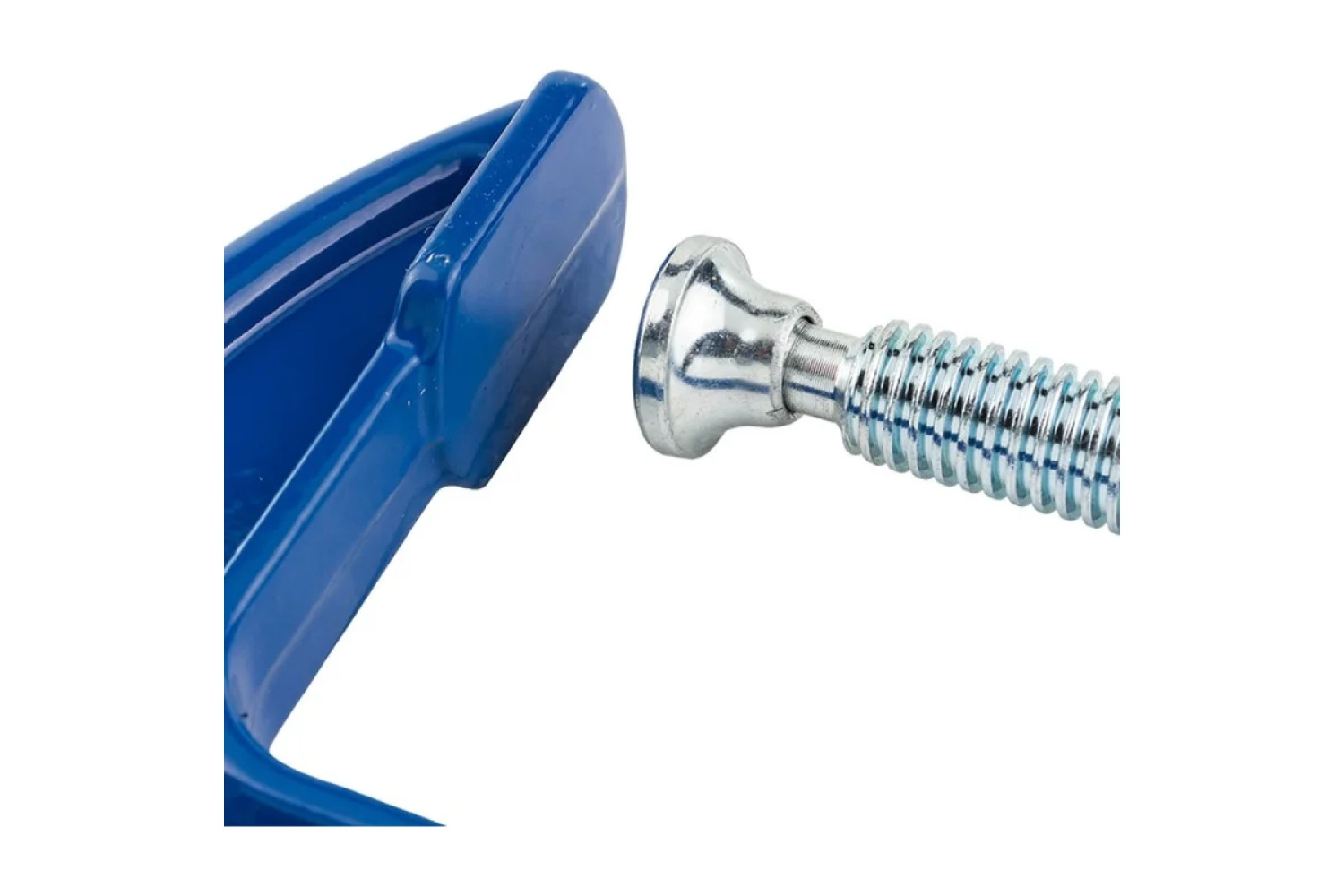 Струбцина состоит из двух элементов: подвижного механизма, который регулирует силу зажима и расстояние между губками, а также рамы. У подвижной части имеется специальный рычаг для удобства работы и надежной фиксации заготовки. Максимальный диапазон зажима составляет 5-125 мм.
