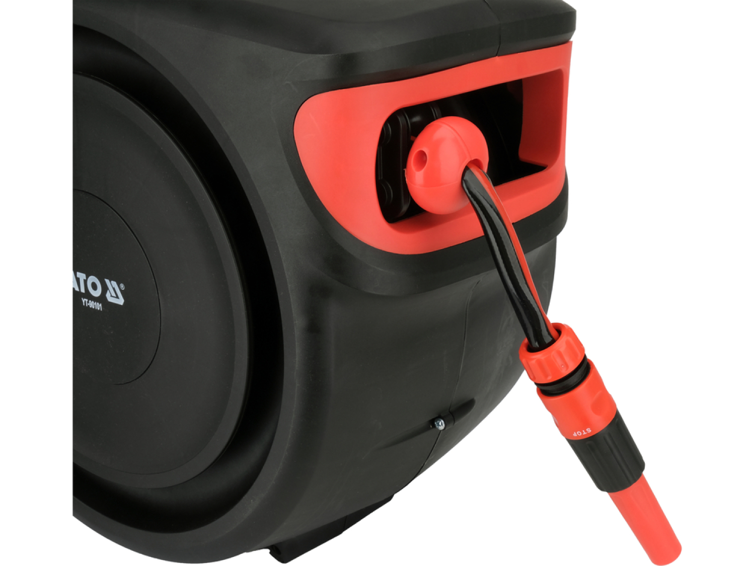 Автоматическая катушка для шланга YATO (модель YT-90101) с длиной шланга 25 метров, устанавливаемая на стену, упрощает организацию пространства. Этот продукт ускоряет вытаскивание и наматывание шланга после полива, а также позволяет хранить его без изгибов и запутываний. Полное скрытие шланга в катушке помогает поддерживать порядок в саду или возле дома.