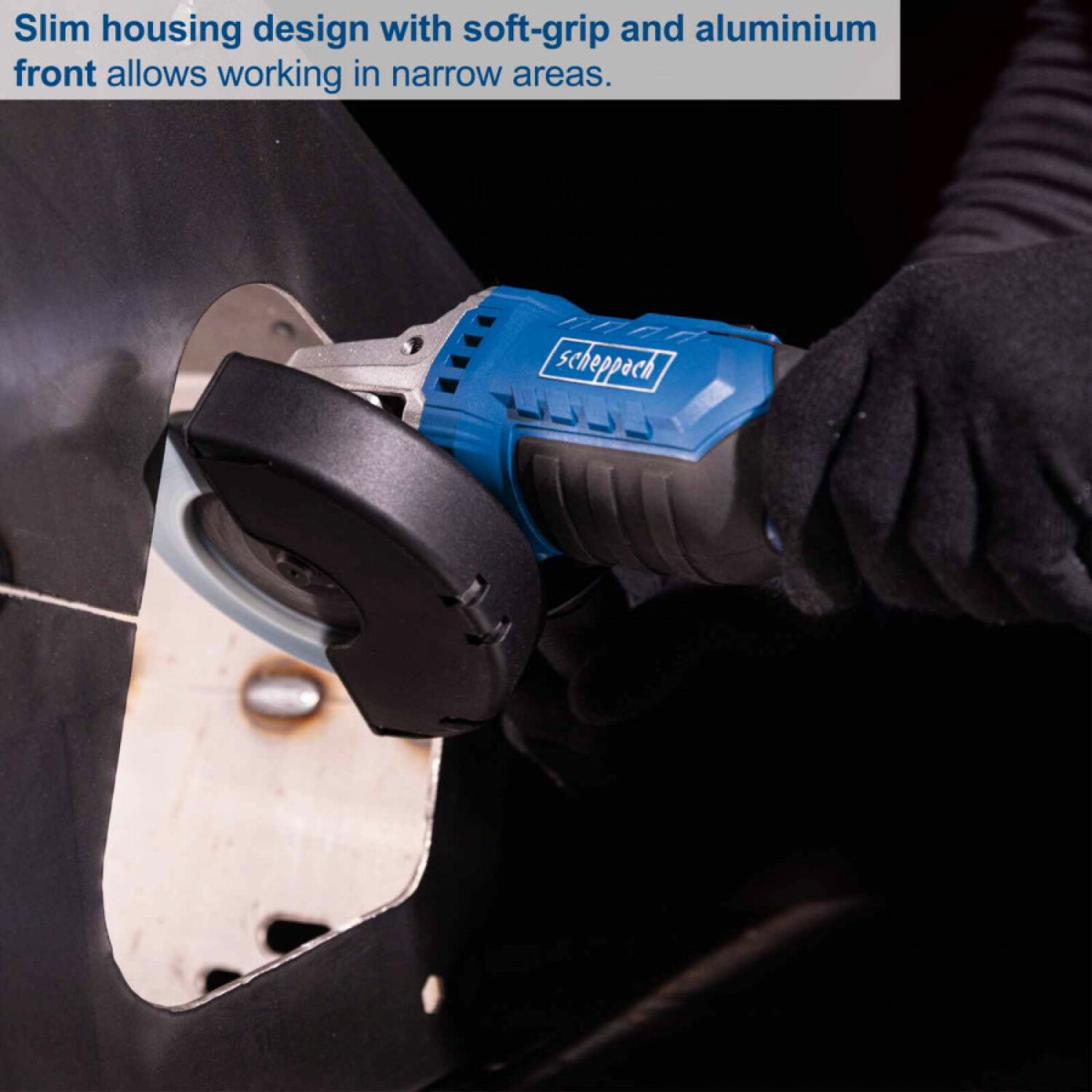 Эта мощная аккумуляторная угловая шлифмашина позволяет легко работать даже в ограниченных пространствах благодаря узкому корпусу с мягкой ручкой и алюминиевым передним покрытием. Интегрированная мягкая стартовая функция и защита от перегрузки обеспечивают долгий срок службы инструмента. Ударопрочная защита может быть отрегулирована без инструментов.